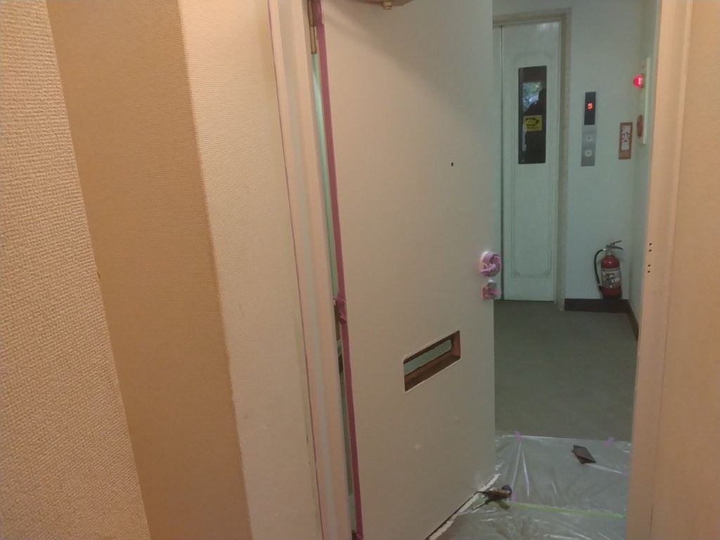取っ手、覗き穴、郵便受け、床などにマスキングとビニール養生を実施。塗料の飛散や付着を防ぎながら、作業スペースを整えました。